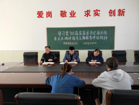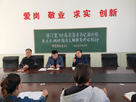 太阳成集团tyc234cc官网于2019年9月18日下午一点,在安保处二楼会议室召开学习贯彻落实省委书记张庆伟来大庆调研指导主题教育讲话精神的会议,此次大会由太阳成集团tyc234cc官网院长、党总支书记邵长坤主持召开,太阳成集团tyc234cc官网全体教师党员参加。