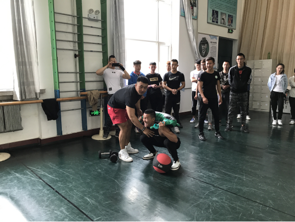 报告结束后,林子轶先生与员工进行了交流,并为我校健美队和社会体育指导与管理专业员工上了一堂动作示范课。课上他为员工制定了WOD(work of Day),并以利用药示翻站、实力推、牛角包实蹲、Burpee、plank作为教学内容,以实例说明了传统健身与Crossfit的区别,并为同学们指出健身训练过程中容易出现的不规范动作,最后对易造成损伤的错误动作进行了纠正。