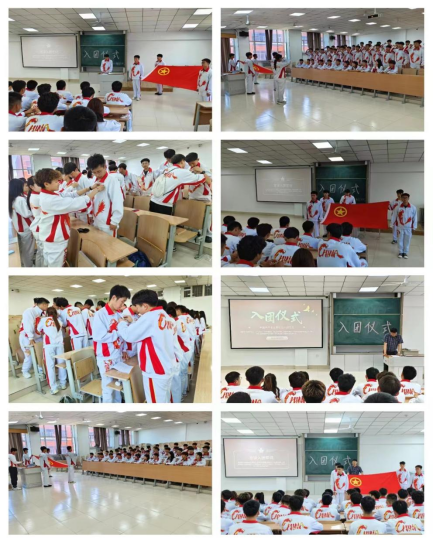 仪式在庄严的国歌声中拉开帷幕,在陈鑫老师宣布新团员名单后,老团员为新团员佩戴团徽,随后由领誓人带领新团员进行宣誓,他们面向鲜艳的团旗高举右手,目光坚定,庄严宣誓,铿锵有力,表达了新团员们对共青团组织的无限向往和为团组织增光添彩的豪迈激情。最后仪式在激昂的团歌中落下帷幕。