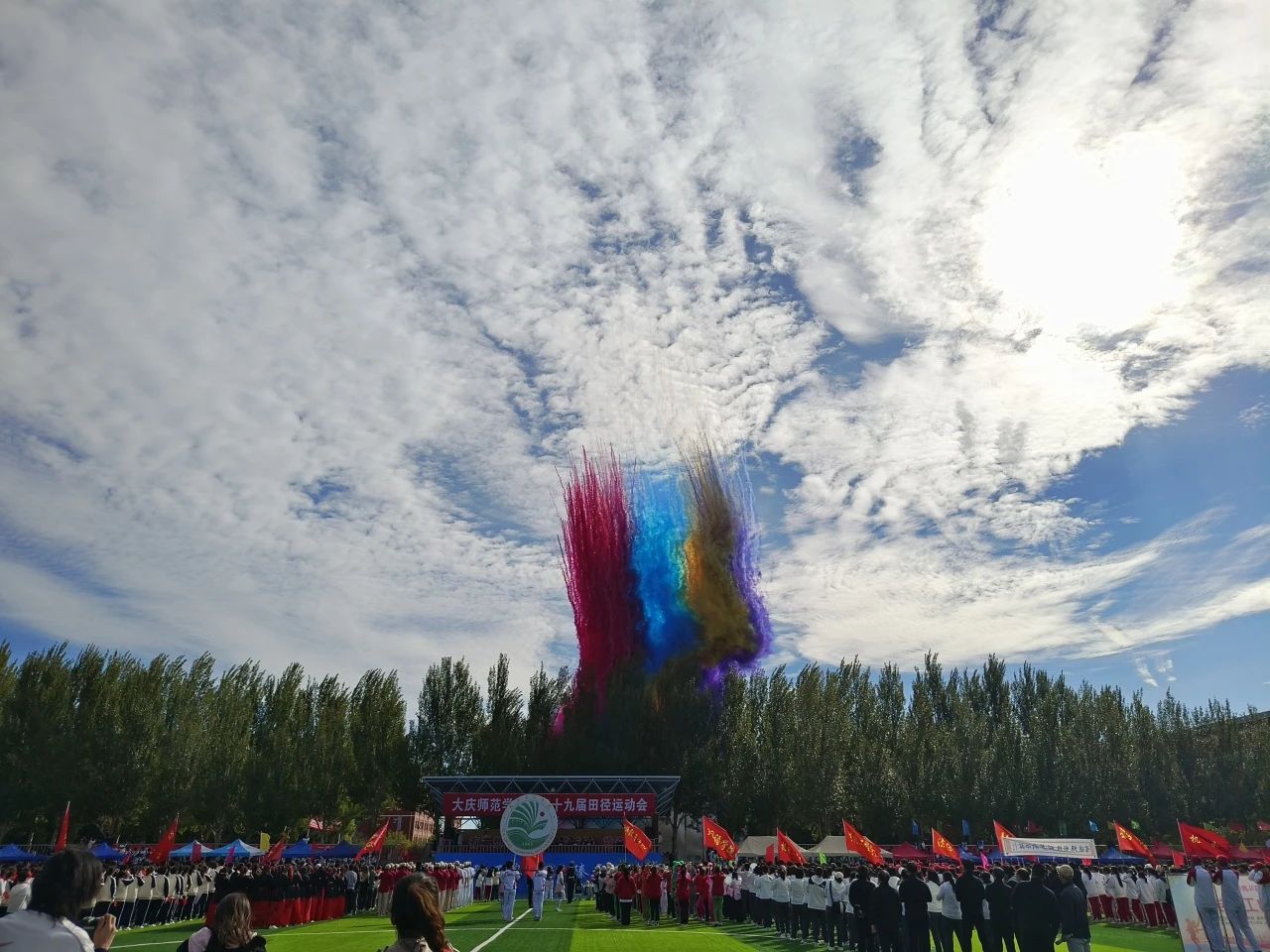 宣誓仪式结束后,刘迪宣布我校第三十九届田径运动会开幕。一时间,运动场五颜六色的彩烟腾空而起,现场顿时变成了欢乐的海洋。全场观众掌声雷动,欢呼雀跃,开幕式气氛达到了高潮。