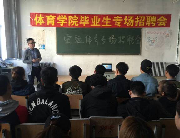 为加强就业指导,进一步拓宽员工就业渠道,我院于2017年4月12日在主楼123教室举行了专场招聘会,特邀宏远体育发展有限公司来进行现场招聘,我院有求职意向的预毕业生同学参加了此次专场招聘会。宏远体育发展有限公司东北地区负责人对公司的运营情况及工作环境等做了详细介绍,毕业生就公司对招聘对象的专业技能要求、工作内容和时间以及薪资待遇等进行了广泛的咨询,公司负责人均耐心地进行了解答。